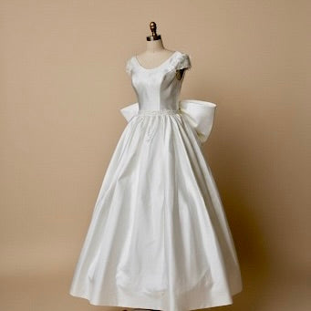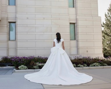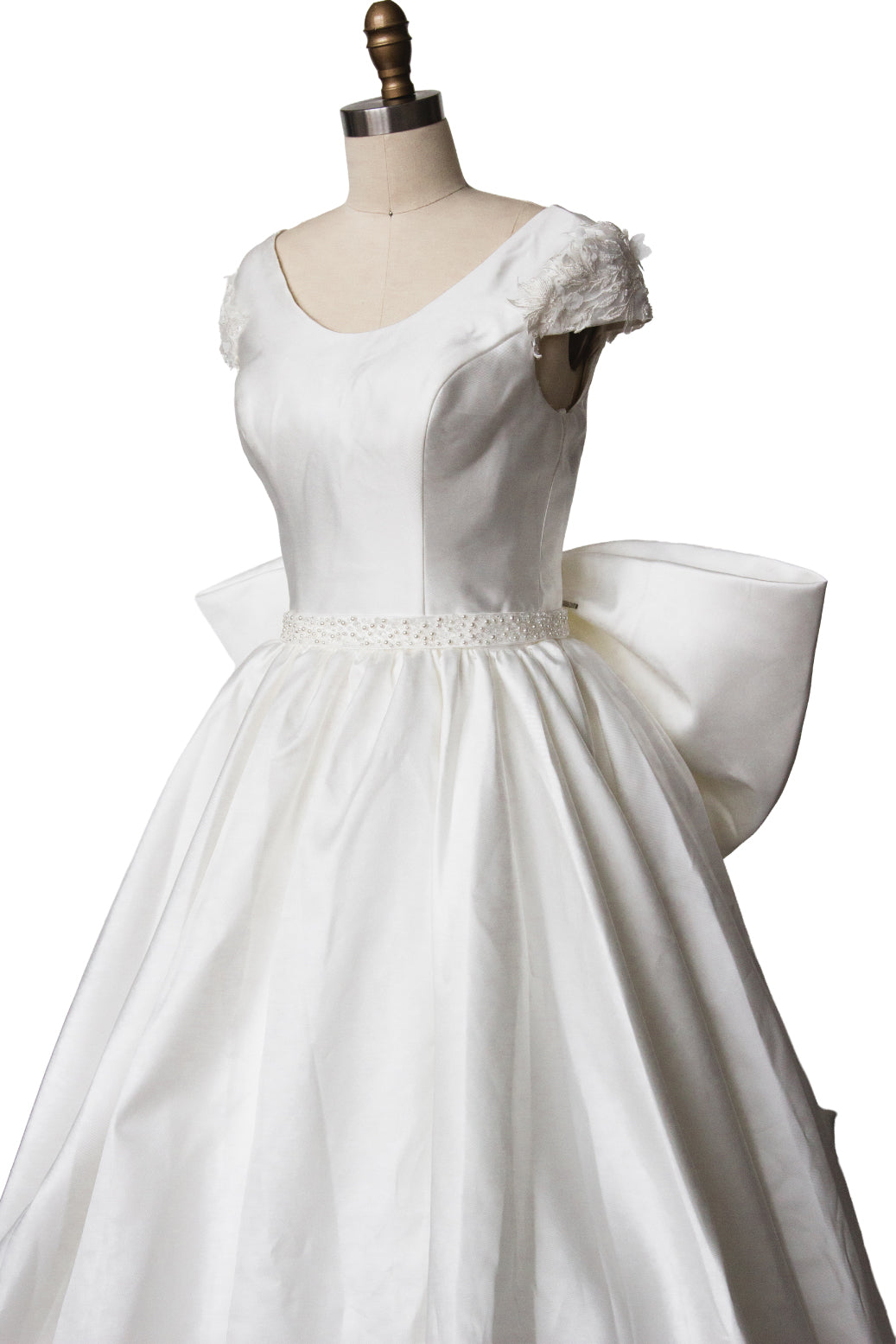 On her wedding day, the bride will be more than a vision—she will be a living embodiment of the camellia’s timeless symbolism. Crafted from luxurious matte bridal satin, this gown reflects the flower’s meaning of devotion, admiration, and eternal love. The floral lace cap sleeves mirror delicate camellia petals, while the pearl-beaded waistband evokes refinement and quiet grace. As she walks, the full satin skirt flows into a soft train, commanding admiration and leaving an impression of purity and poise. Like the camellia itself, her beauty will feel effortless, enduring, and unforgettable.