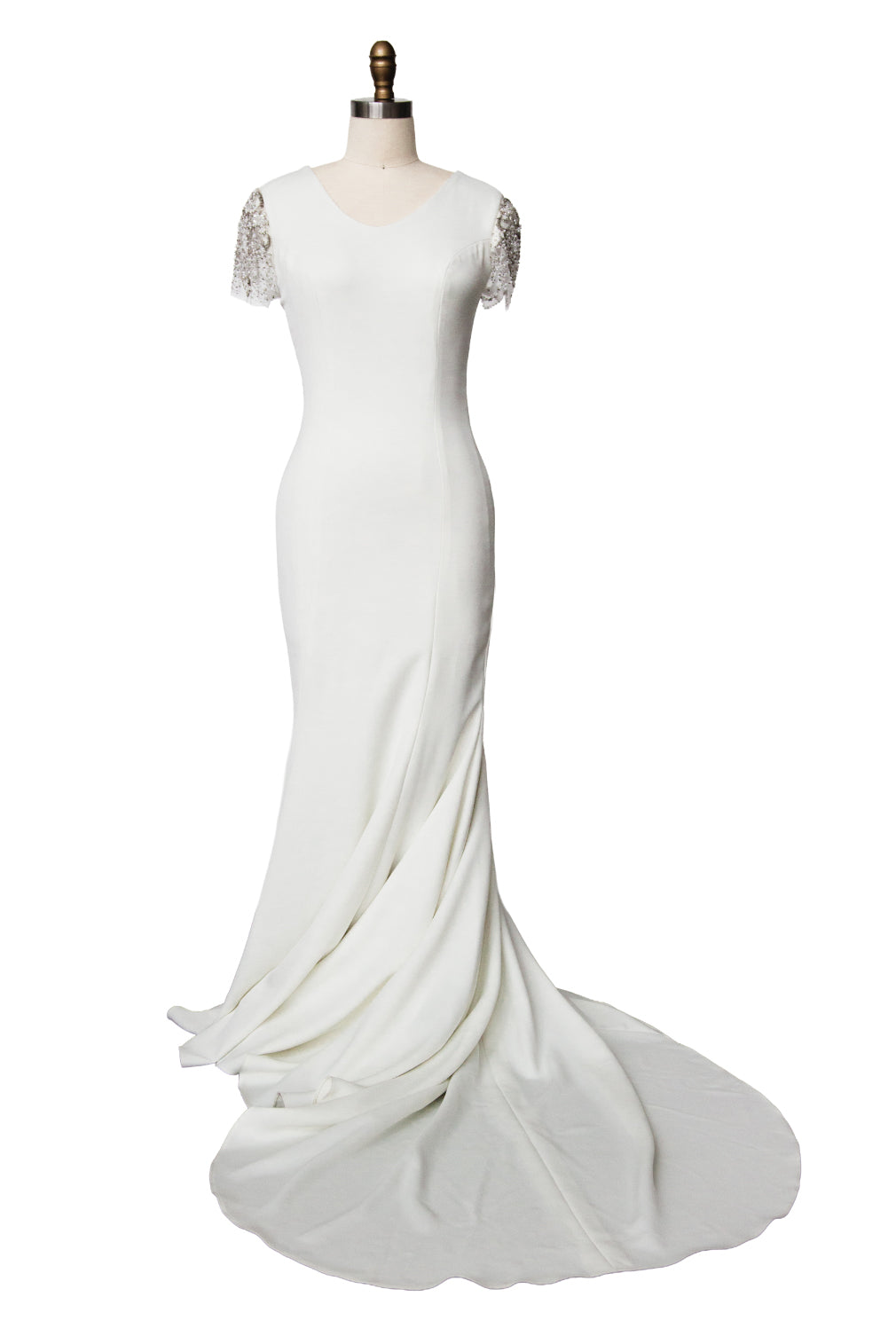 With its sleek stretch-crepe silhouette, luminous beaded cap sleeves, and a row of buttons that sweeps to the hem, the gardenia dress captures the essence of the flower it’s named for — pure, elegant, and unforgettable. Your loved ones will see you not just as a bride, but as the very vision of grace and joy.