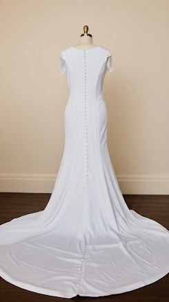 The hand-beaded cap sleeves shimmer like dew on gardenia petals, drawing admiring glances without overpowering the gown’s clean, elegant lines. As you pass, your guests will notice the endless row of fabric-covered buttons trailing down your back — a detail that will remain etched in their memories, just like the soft fragrance of a gardenia lingers in the air.