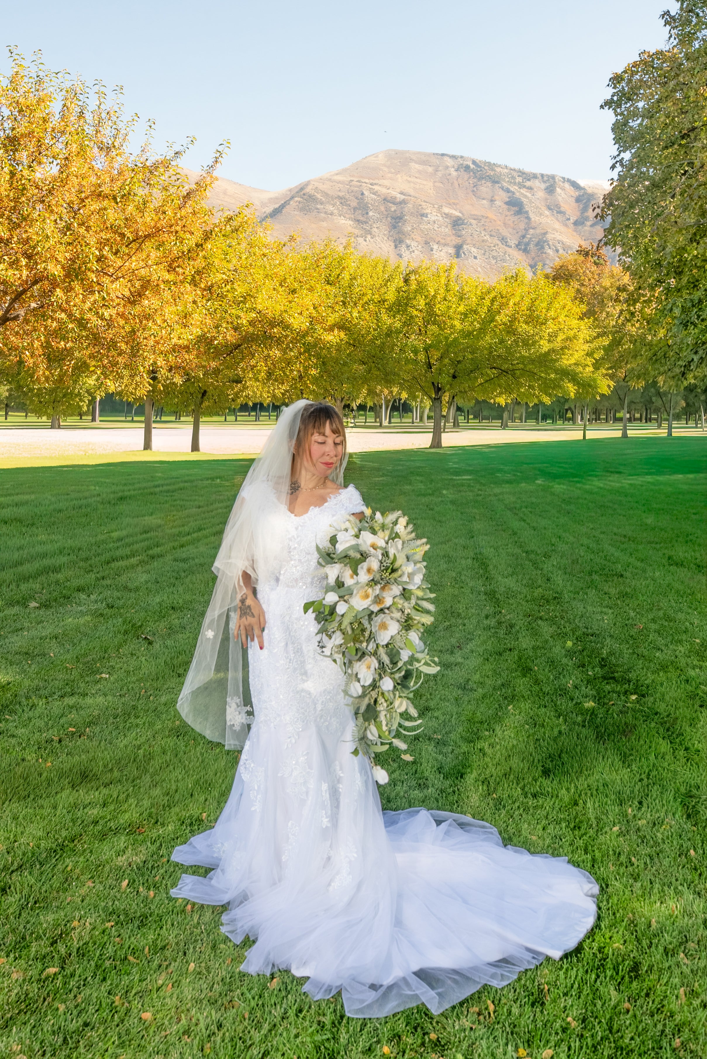 The illusion neckline frames her face with delicate beauty, while the cap sleeves add a romantic vintage touch. The mermaid silhouette embraces her shape with elegance, symbolizing devotion and strength, before flowing into a chapel-length flare that sweeps the floor with ethereal movement.
