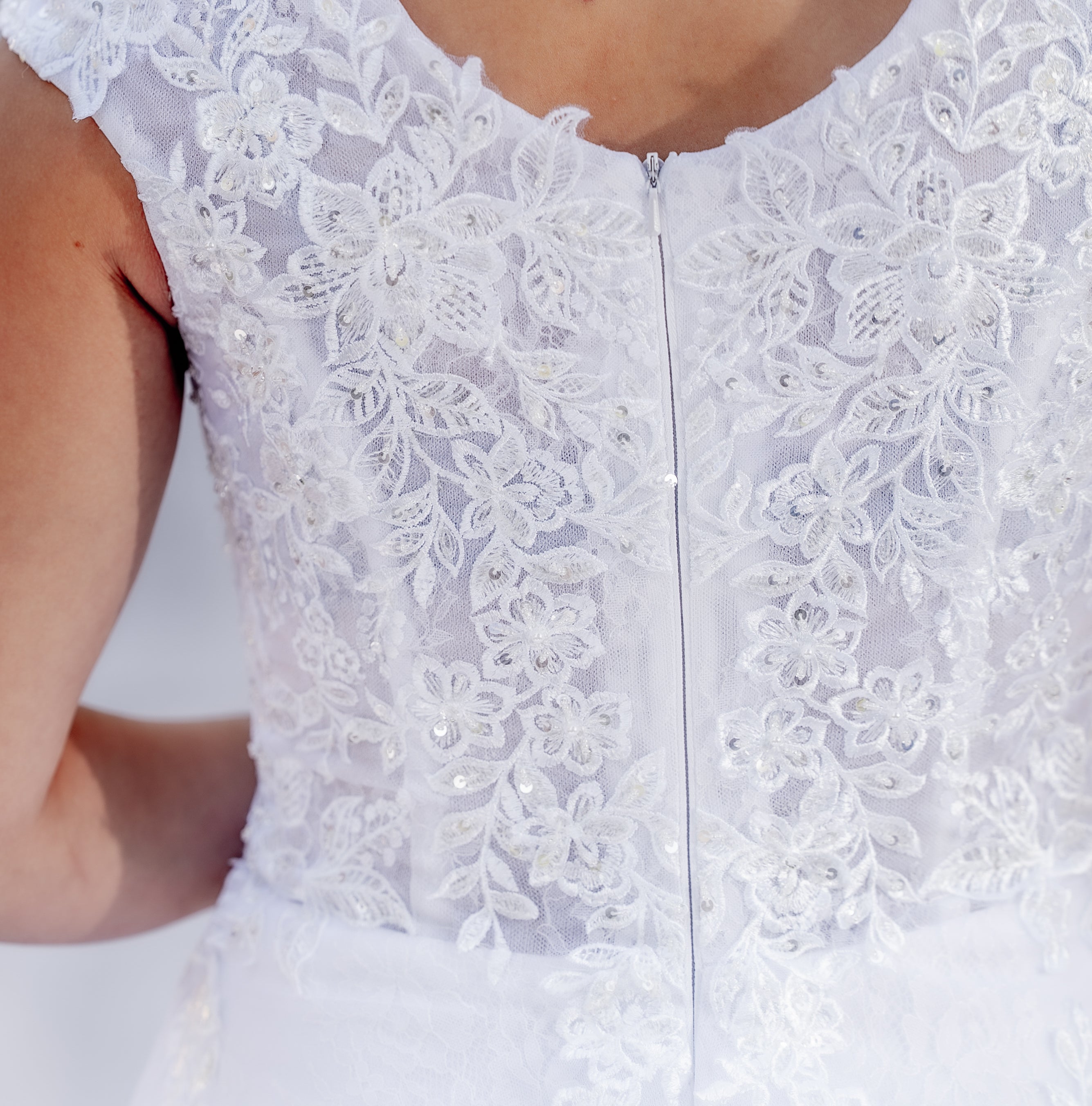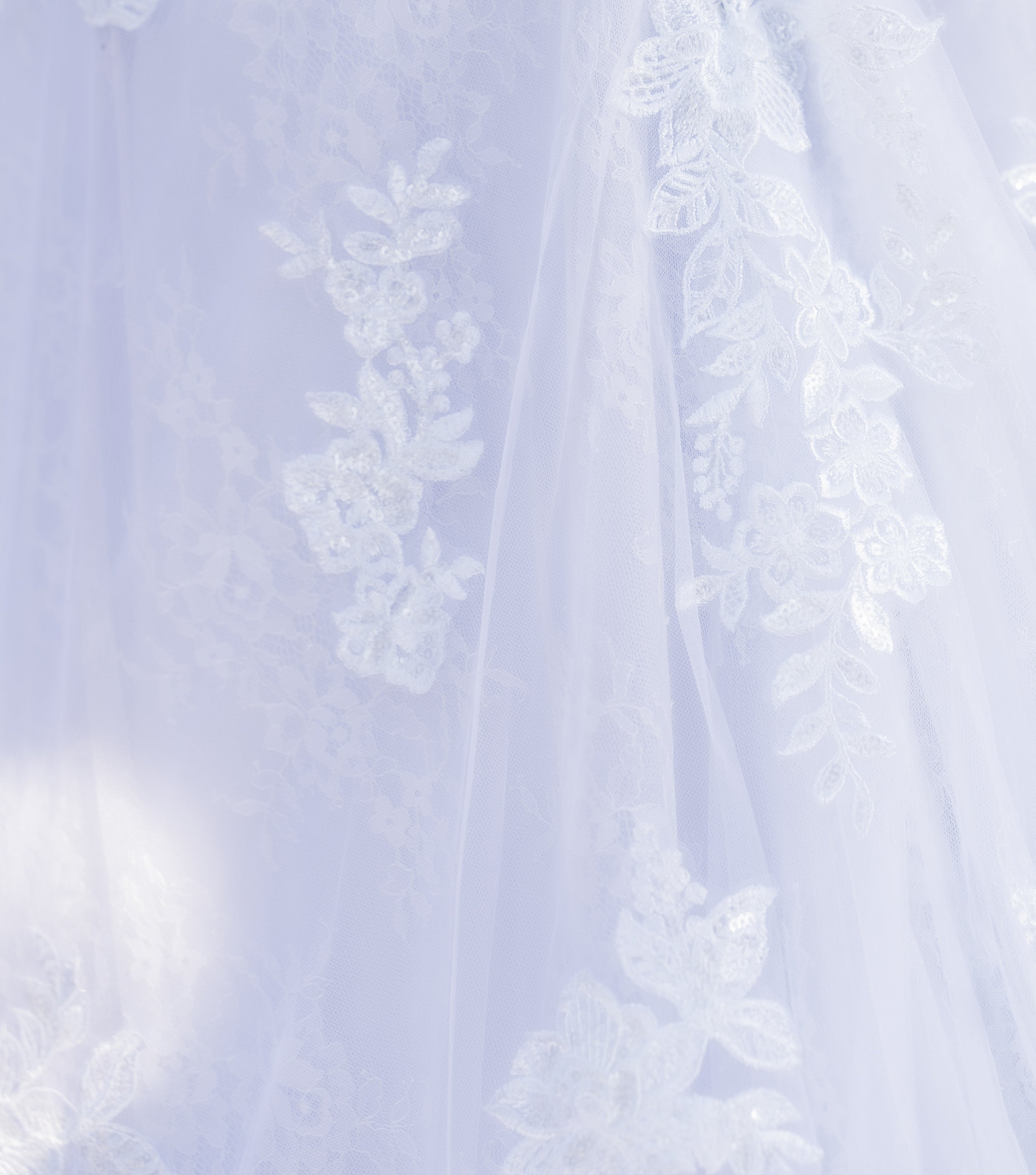 Just as the violet flower has symbolized modesty, loyalty, and everlasting love for centuries, this gown captures those same qualities in every detail. The sheer mesh overlay is adorned with intricately embroidered floral lace, representing the delicate yet enduring nature of true love. Beneath, a soft matte satin and Chantilly lace lining provides a gentle, fluid movement that mirrors the grace with which you’ll glide down the aisle.